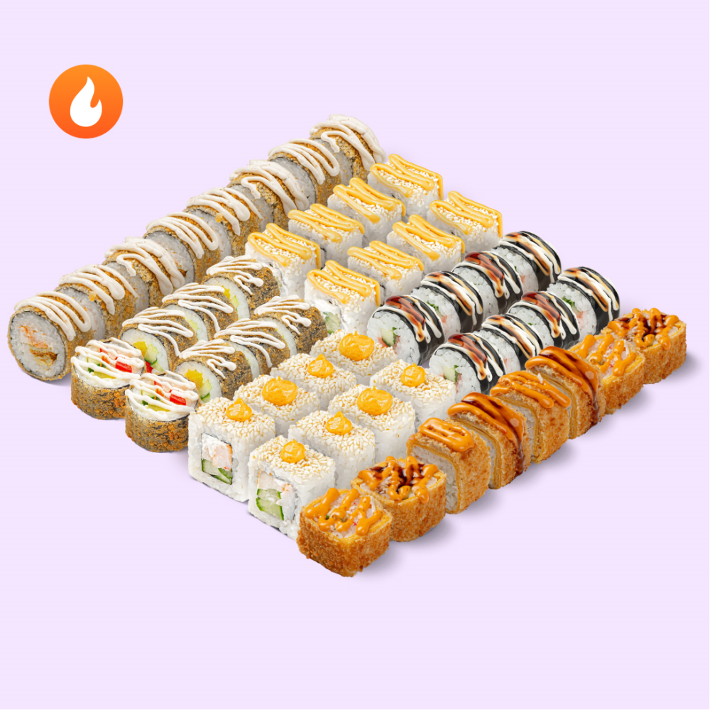 Шокирующее обилие креветки и краба в начинке. Удивляйся вкусам большого сета вместе с друзьями. Состав: Яссай спайс с трюфельным соусом, Креветка 1000 островов, Терияки маки, Тори темпура, Том ям с креветкой, Краб темпура