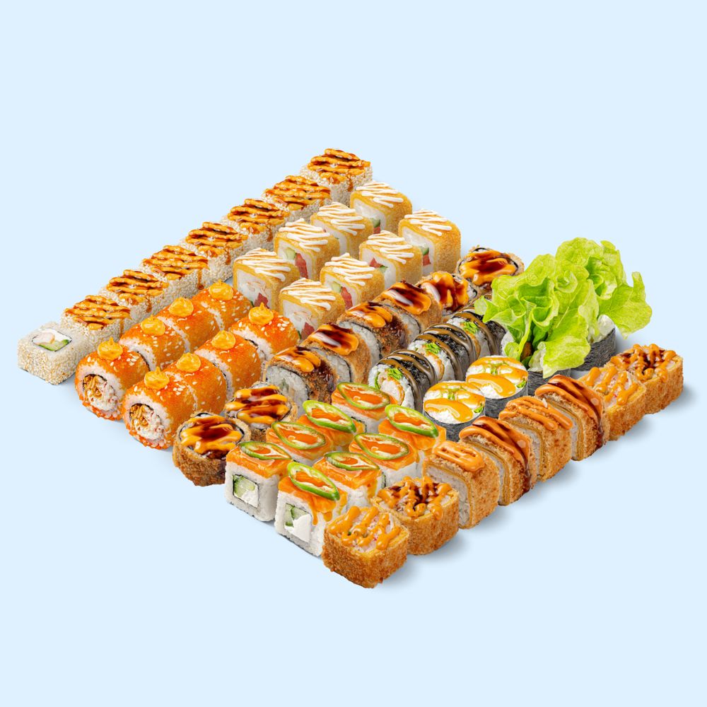 Предложи друзьям поучаствовать: они по достоинству оценят Большой Дерзкий Морской Сет. Состав: Калифорния кранч том ям, Чикен темпура, Цезарь BIG, Том ям, Креветка лемонграсс, Филадельфия Мексика, Краб темпура