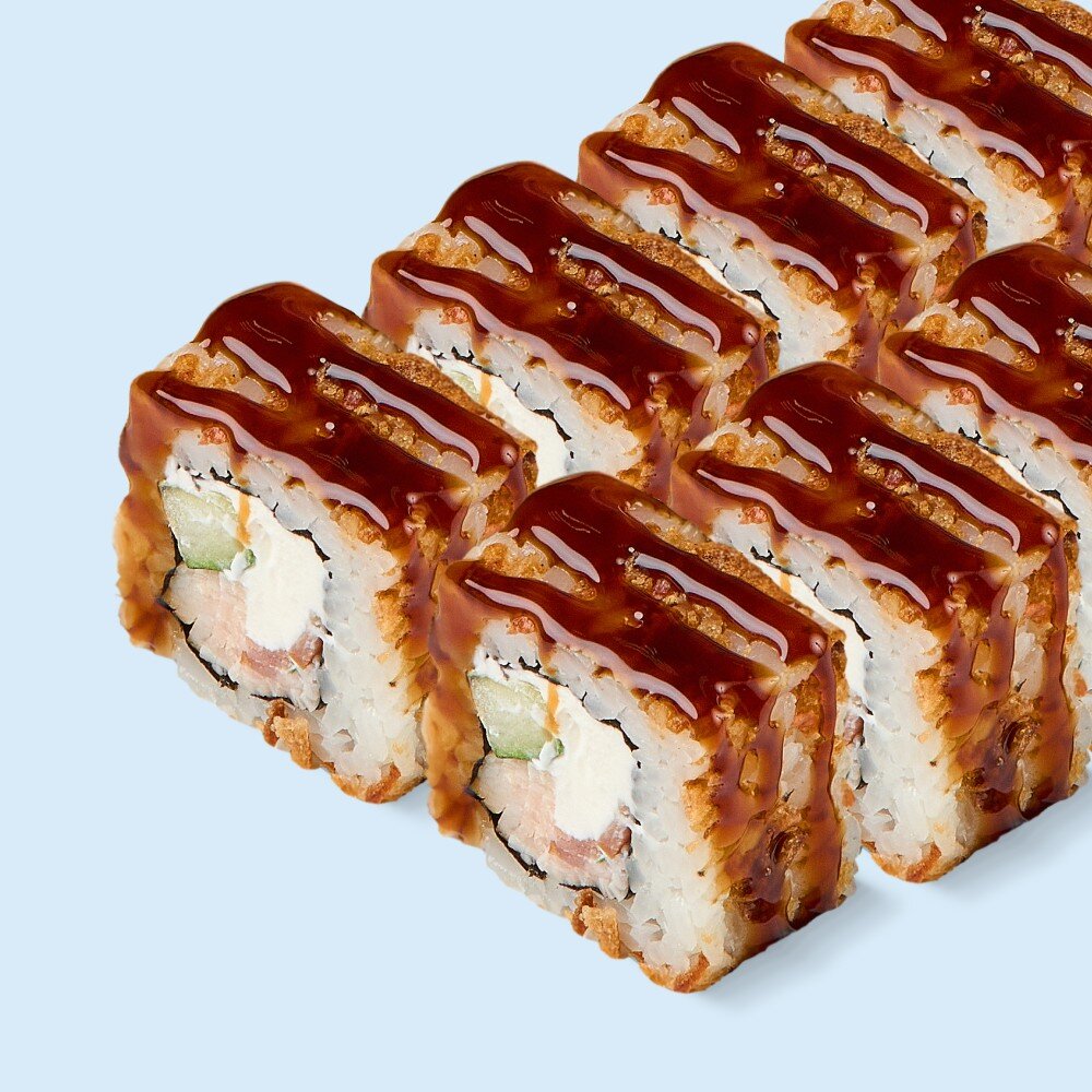 Бекон, огурец, сливочный сыр, лук фри, рис, нори, соус унаги