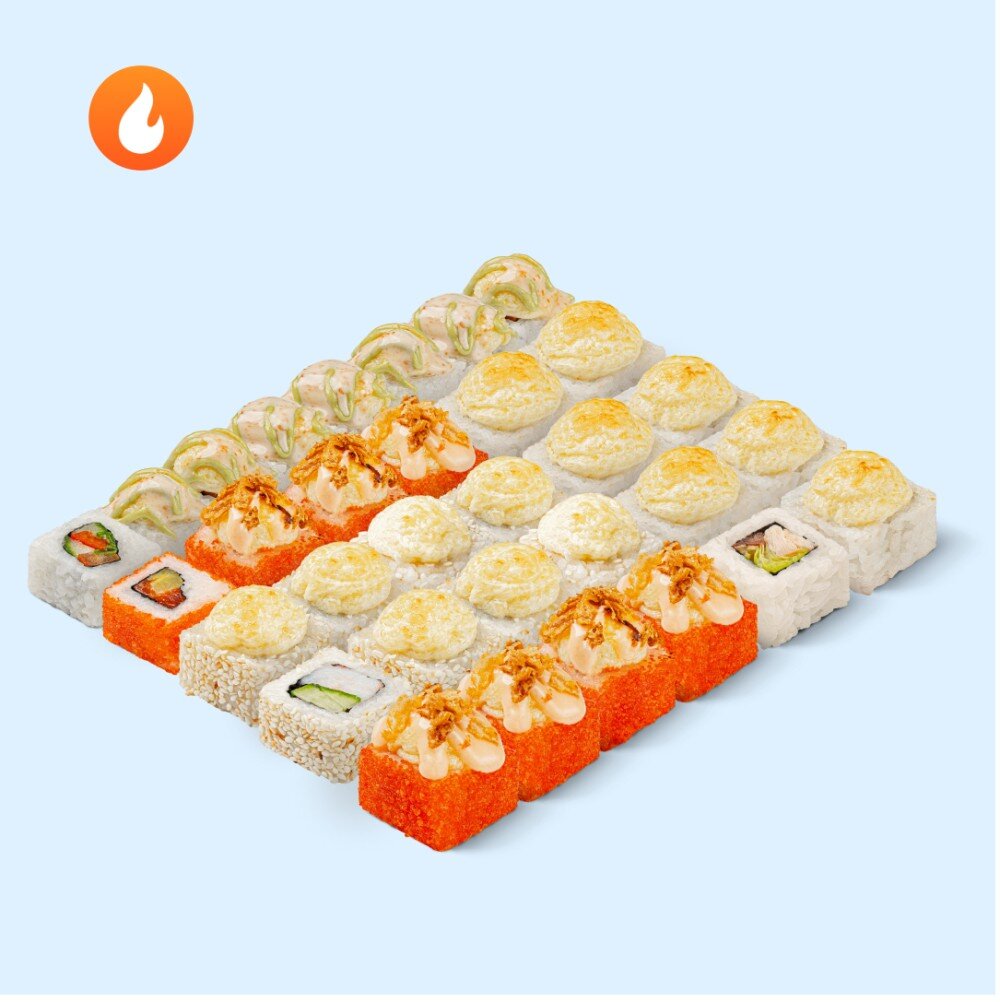 Запечённый сет с лососем, креветкой и курицей так и рвётся на стол.Состав: Запечённый с курицей NEW, Запечённый с креветкой, Запечённая филадельфия с лососем, Веган-микс