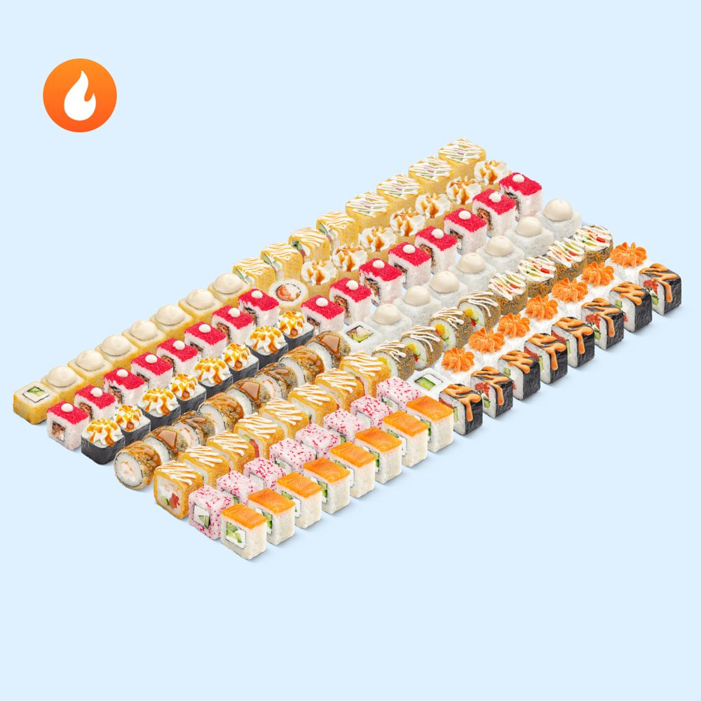 Искра между вами запылает с новой силой. Как добавить огня: понадобятся яркий манго-чили, благородный трюфель и немного лемонграсса. Раздели со второй половинкой роллы со вкусами, которые вызовут экзотический экстаз. Состав: Лосось с тобико и трюфельным соусом Х2, Яссай спайс с трюфельным соусом, Филадельфия темпура с соусом лемонграсс, Цезарь, Веджи спайс с соусом манго-чили, Сяке кунсей маки, Филадельфия лайт, Каваи, Цезарь BIG с трюфельным соусом, Эби темпура с соусом лемонграсс, Краб терияки с соусом манго-чили, Цезарь темпура, Тортилья с курицей и трюфельным соусом