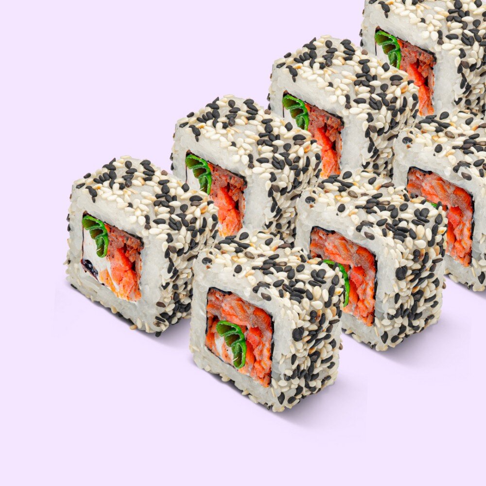 Лосось жареный, сыр сливочный, лук зелёный, кунжут чёрный, кунжут белый, рис, нори.