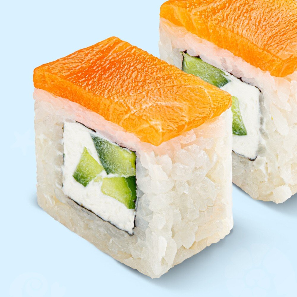 Рис, мицукан, сахар, комбу, соль, нори, сыр сливочный, огурец, лосось