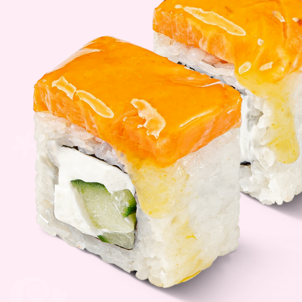Нежный лосось, сливочный сыр и огурец под экзотической поливкой. Состав: лосось, нори, огурец, рис, соус чили-ананас, сыр сливочный
