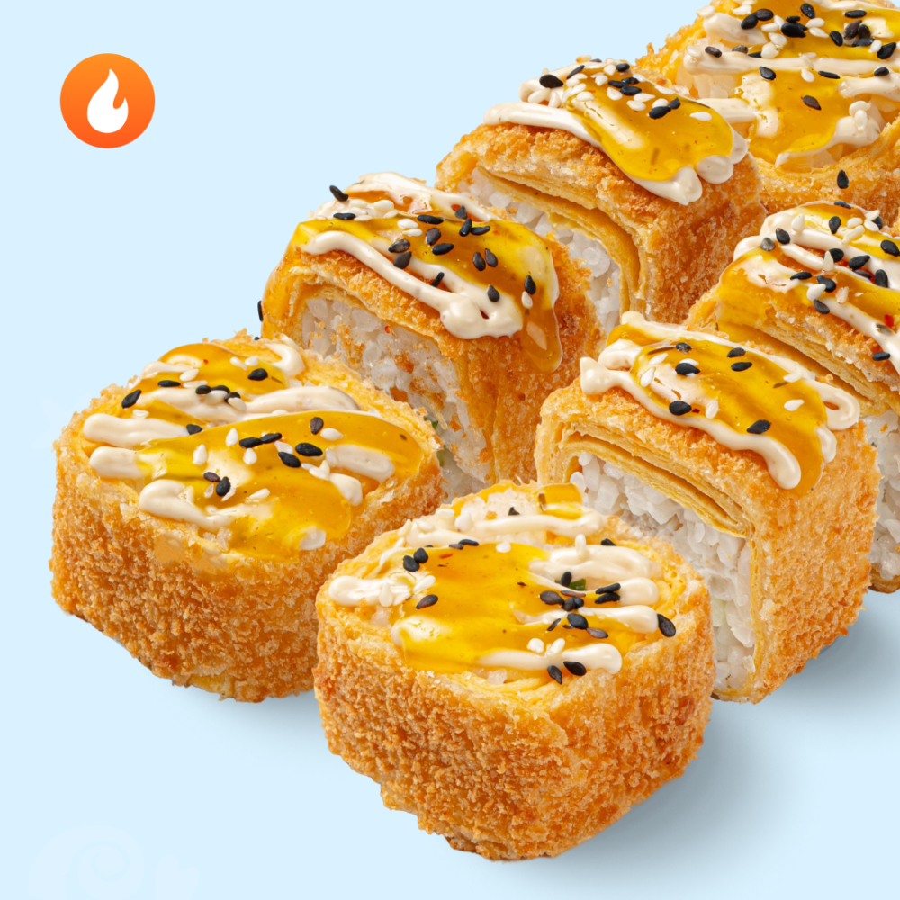 Нежный вкус курицы становится более дерзким под сладко-острым соусом. Состав: курица жареная, кунжут чёрный, кунжут белый, соус чили-ананас, соус цезарь, огурец, сухари панировка, сыр сливочный, кляр, рис, тортилья