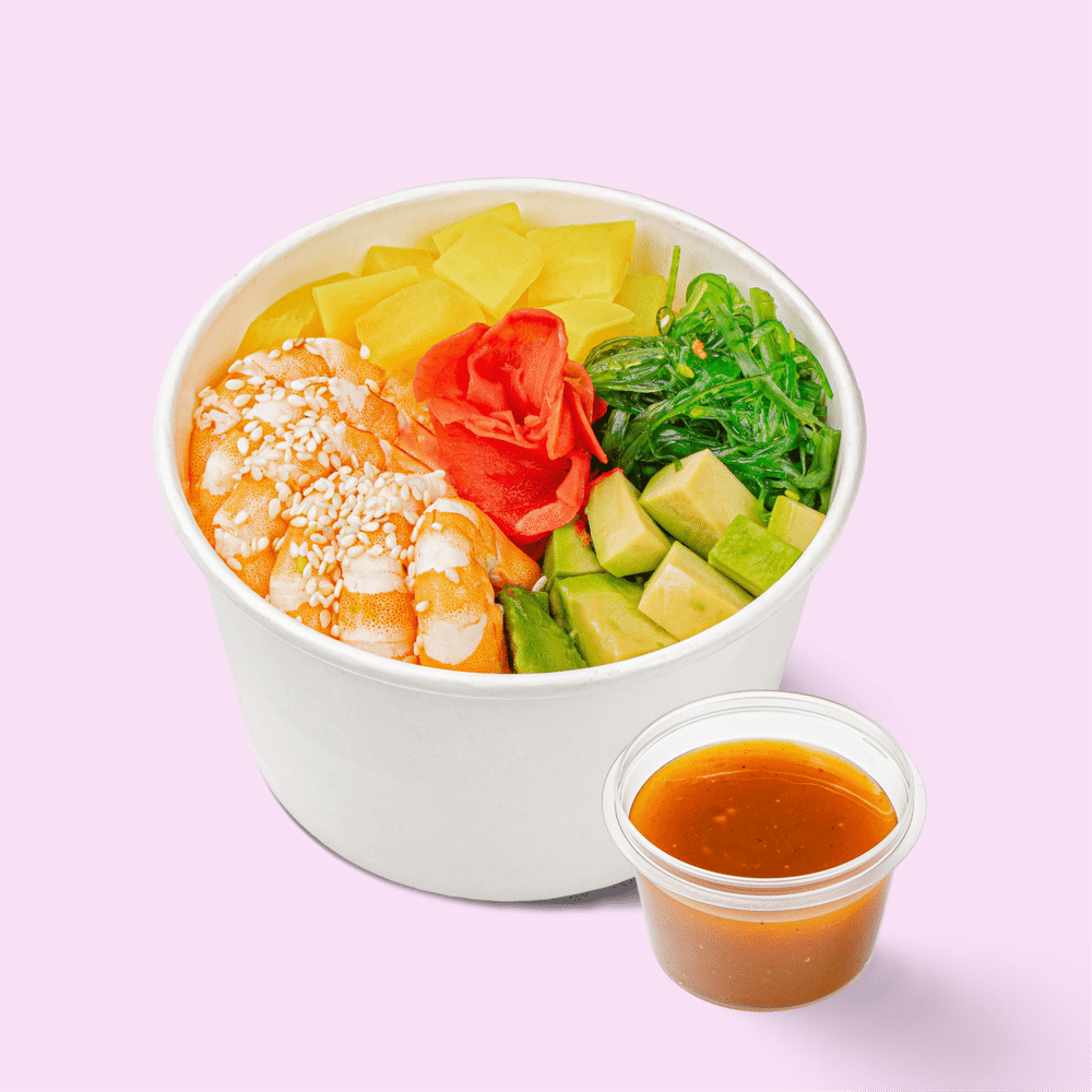 Бери на перерыв экзотический салат с креветкой. Состав: рис, креветка, чукка, авокадо, такуан, имбирь маринованный, тобико оранжевая, кунжут белый, соус свит чили / том ям