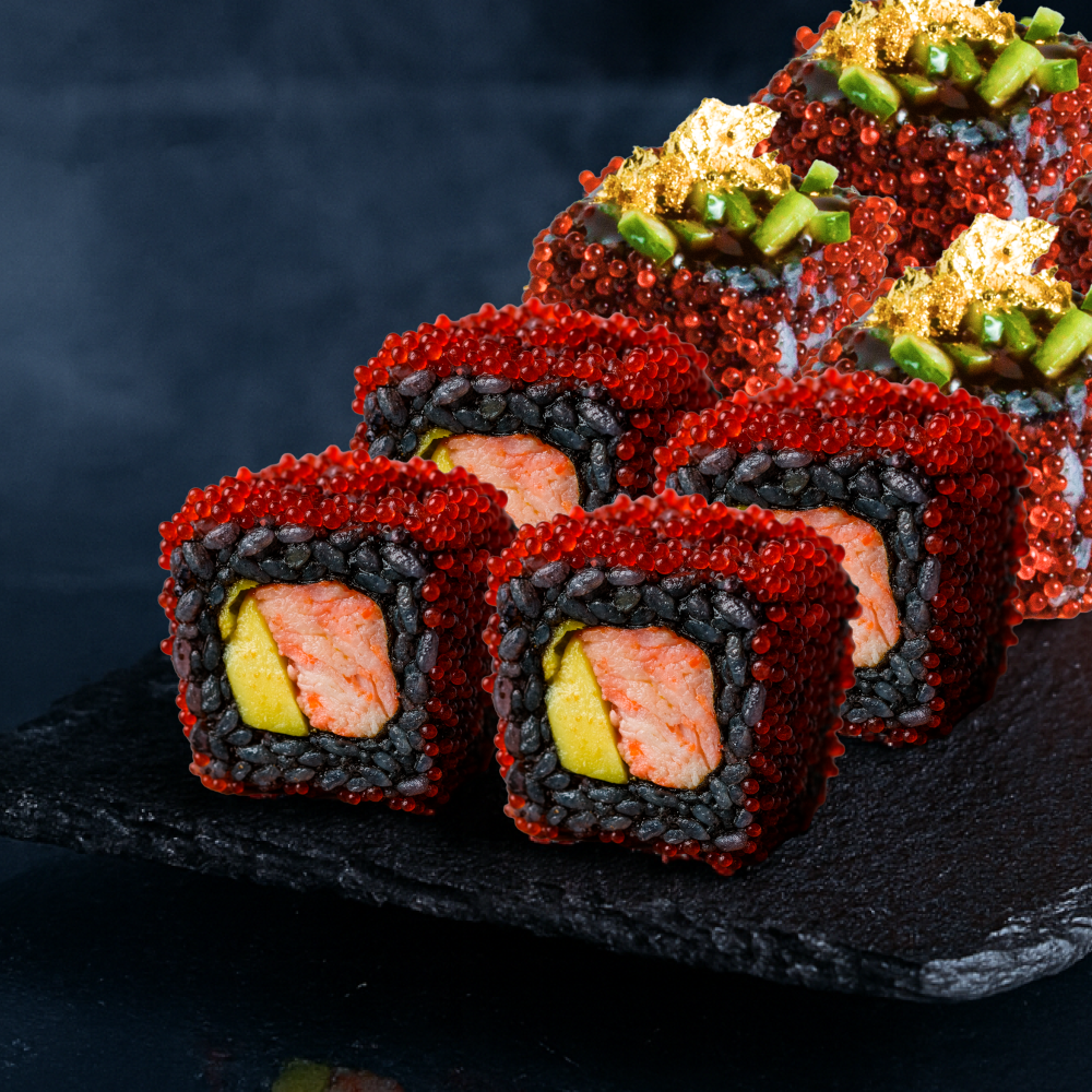 Любишь роскошь? Здесь твоя порция счастья! Блестит лучше любых украшений.Состав: Нори, чёрный рис, лосось, краб-майонез, авокадо, тартар из огурца, сусальное золото, тобико.